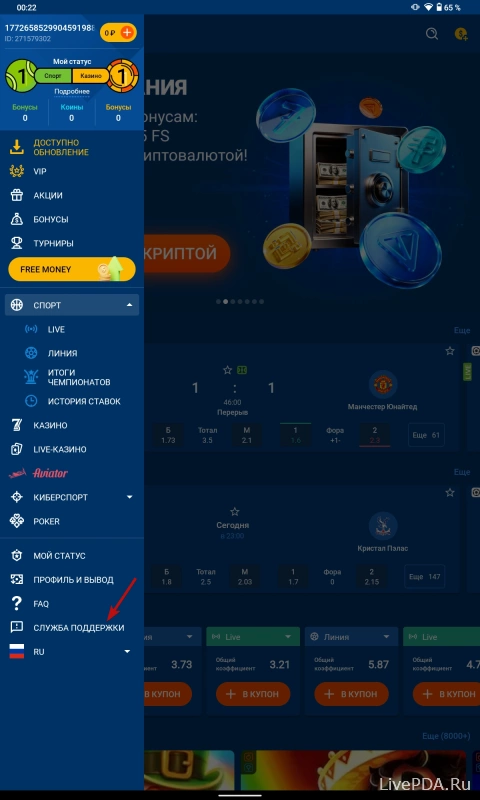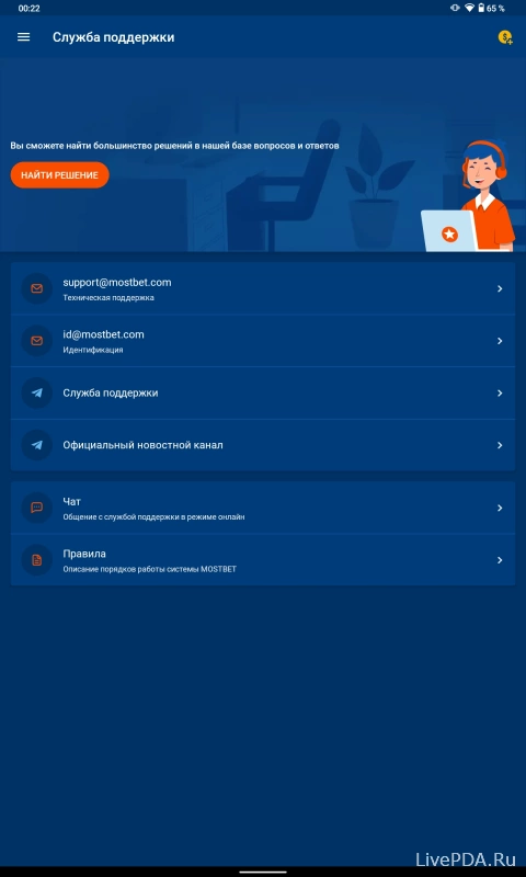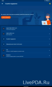 В нижней части открывшегося слева меню кликните по пункту «Служба поддержки». Вы увидите список контактов, по которым можно связаться с техническими специалистами Мостбет.