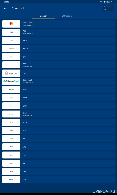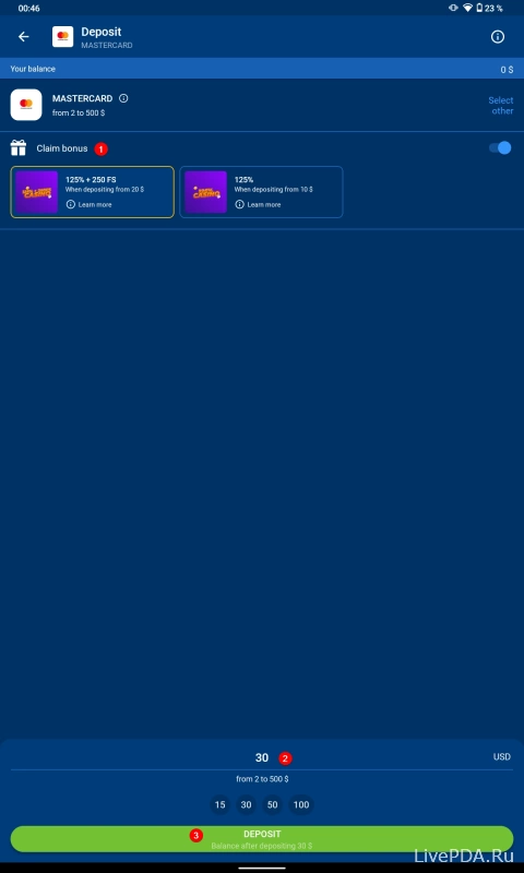 In the next menu, select a bonus and enter the desired deposit amount. Then tap “Deposit” and follow the instructions of the payment system. After the transfer, the funds will be credited to your account within a few minutes.