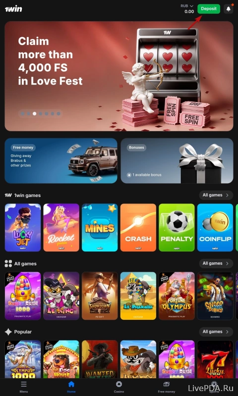 You can access the deposit page directly from the main screen. Click the green «Deposit» button located in the top right corner.