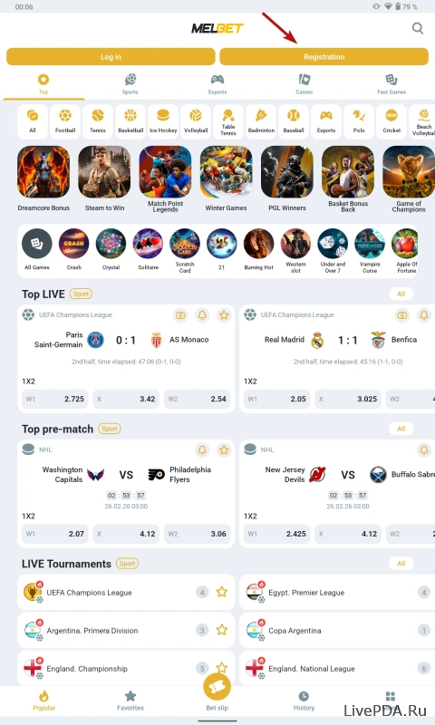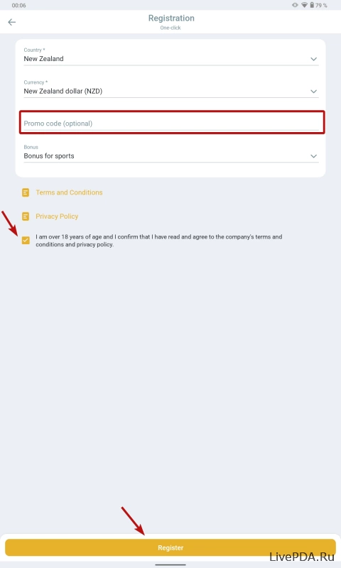 A promo code can only be entered when creating an account. Click the «Registration» button located in the top right corner of the app’s main page.