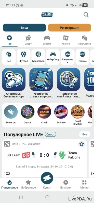 Coldbet is a relatively new bookmaker, but the company has already managed to establish itself in the CIS and European market. Here you'll find sports betting, eSports, and a casino with slots. You can place bets through the site or download the Coldbet mobile application for Android, which is much more convenient.